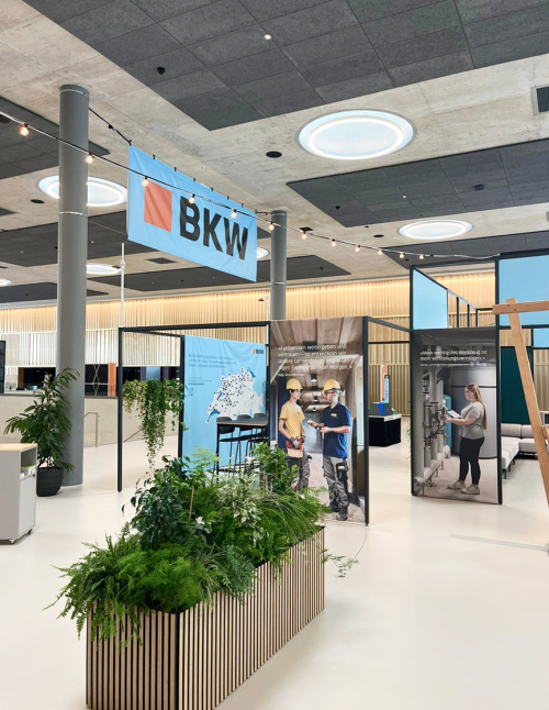 Für Berufsmessen wie die Swiss Skills in Bern und die Berufsmesse in Zürich haben wir grossflächige Druckdaten für Fahnentücher, Dibondplatten, Fernerkennungen und Stelen erstellt, immer im Einklang mit dem CI/CD der Marke BKW. Die vorgegebenen Inhalte haben wir grafisch so aufbereitet, dass das gewünschte Zielpublikum gezielt erreicht wird und die Botschaften der Messestände optimal wirken. Alle Massnahmen wurden speziell auf die Anforderungen des Employer Brandings ausgerichtet, um potenzielle Lernende und Mitarbeitende effektiv anzusprechen.