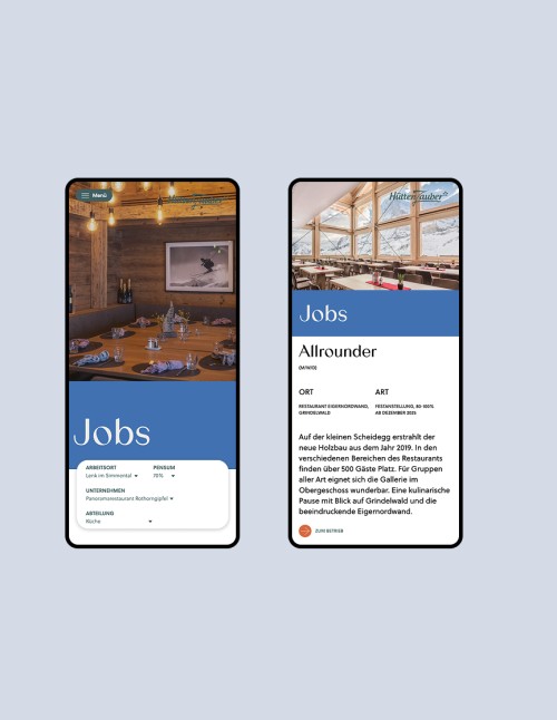 Die neue Hüttenzauber-Website spiegelt die Schönheit der Schweizer Bergwelt wider: Harmonie und Klarheit stehen im Vordergrund, unterstützt von Farben, die an Bergseen, Enzianblumen und Nadelwälder erinnern. Verspielte Schriftzüge setzen Akzente, während gut lesbare Lauftexte für eine moderne und zugleich traditionelle Anmutung sorgen. Die Neugestaltung umfasst Design, Seitenstruktur, Inhalte sowie Farb- und Typografie Entwicklung. Dank der engen Zusammenarbeit mit dem Kunden und externen Partnern entstand eine Website, die Nutzer:innen auf einfache Weise durch das vielfältige Angebot von Hüttenzauber führt.